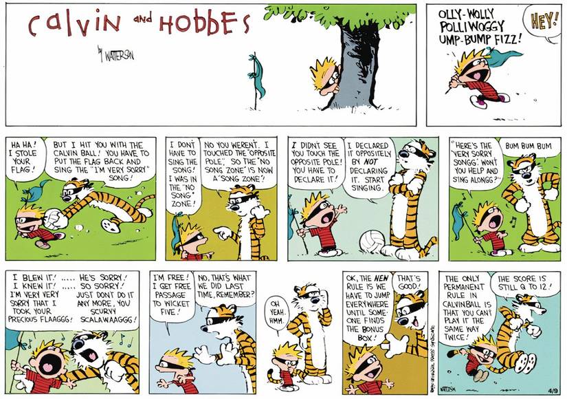 Calvinball was the favorite game of Calvin and his tiger companion, Hobbes. It is characterized by a complete lack of fixed rules, allowing any player to make up rules on the spot. As Calvin himself
